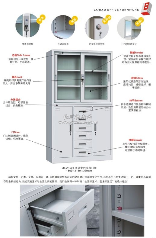 品名:來寶 寬體中六斗移門柜 中六抽半玻璃書柜