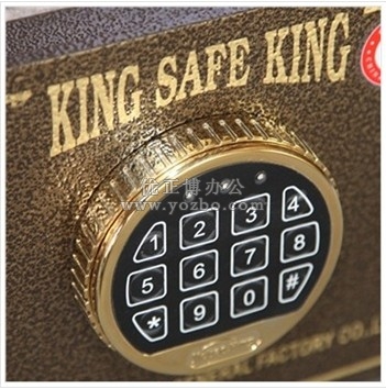 c.表面采用仿古銅繁花噴塑技術,色澤亮麗高貴典雅;箱體內部以駝色壁毯裝飾,分成擱板鑲嵌鍍鉻裝飾條,增添豪華質感(采用戶外型純樹脂粉末靜電噴涂工藝,此工藝一般運用在汽車等工藝)耐水洗、耐腐蝕、不褪色。箱門上配以圓形金色的多功能電子鎖/液晶觸摸屏操作面板,四周以金色線框勾勒出“KING SAFE KING”字樣,充分展示了金尊系列保險箱的尊貴身份和皇家宮廷風范。
