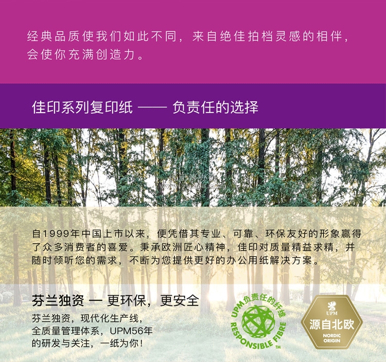 產品特點:品質保障,自始至終 最先進的紙機和裁切生產線、一流的造紙技術和熟練專業的技術員工。高質量的防潮包裝材料,品質承諾,自始至終。 還原色彩,與時俱進特殊軟壓光機和最新表面處理技術制造,無論是噴墨打印還是復印,都能向您呈現完美的圖文效果。與辦公設備制造商緊密合作,讓“欣樂”不斷成長,適應最新需要,讓您時刻享受復印的快樂!享受復印,拒絕卡紙五十多年辦公用紙的專業制造經驗,保證產品的高品質。每批次產品都嚴格檢測,控制紙張的卷曲,保證優異的運轉性能。全自動滾刀裁切機保證良好的裁切質量,避免多張進紙。實踐環保,綠色辦公。
